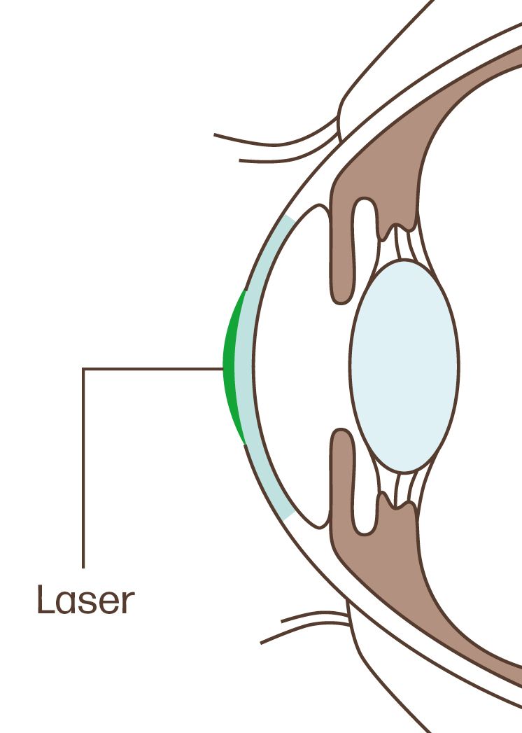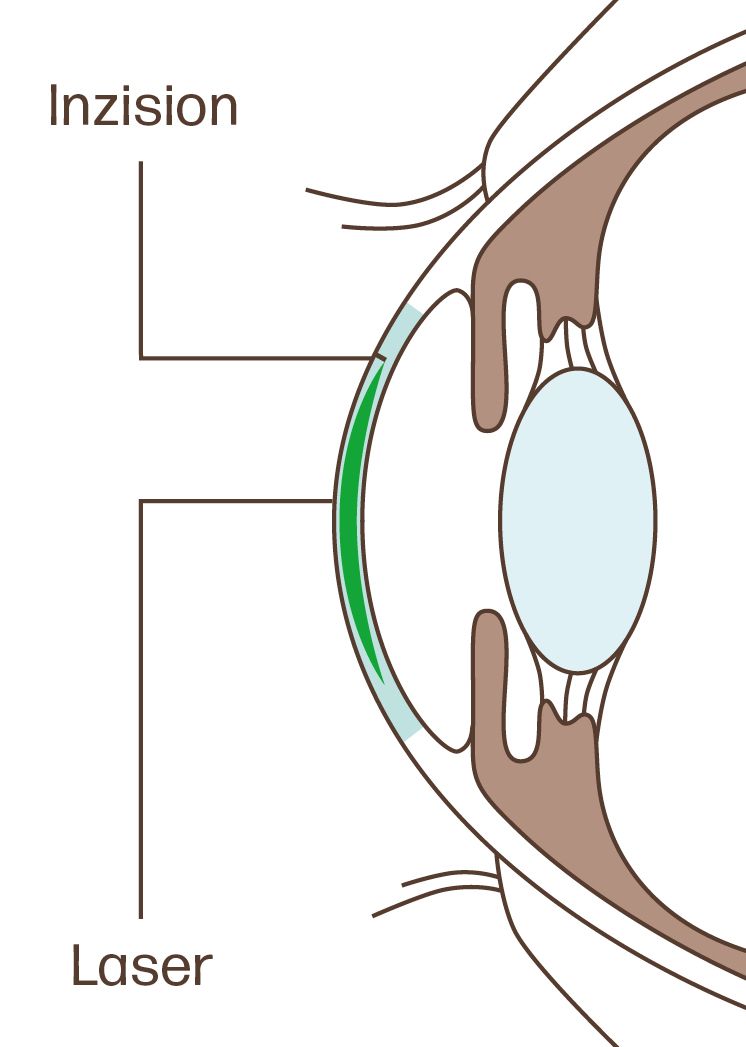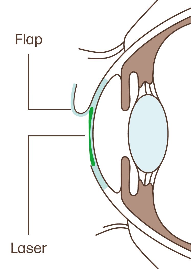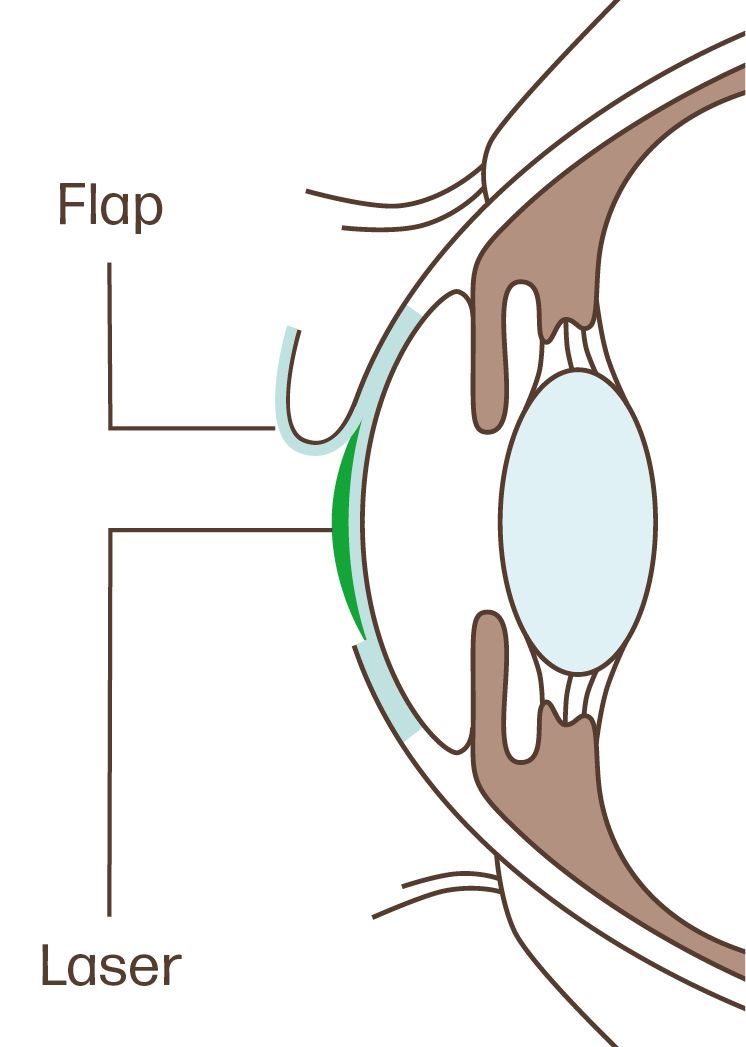Die LASIK (Laser-in-situ-Keratomileusis) ist weltweit der häufigste Eingriff, um die Brillenfreiheit zu erlangen. Hierbei wird in der Hornhaut ein sogenannter Flap kreiert, der während der Laseroperation weggeklappt wird. Während bei der klassischen Mikrokeratom-LASIK der Flap mit einer Klinge geschnitten wird, kann bei der FemtoLASIK der Flap direkt durch einen Laser erstellt werden und ist mit einer höheren Präzision sowie deutlich geringeren Flap-Komplikationen verbunden. Anschließend wird mit einem Excimer-Laser das Hornstroma direkt modelliert, um die gewünschte Zielrefraktion zu erreichen. Nach Zurückklappen des Flaps ist die Laseroperation beendet.